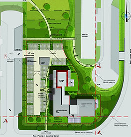 Le bâtiment en forme de L d'unité de matériaux et de couleur brun s’articule autour d’un volume phare de couleur rouge qui relie et anime deux volumes.